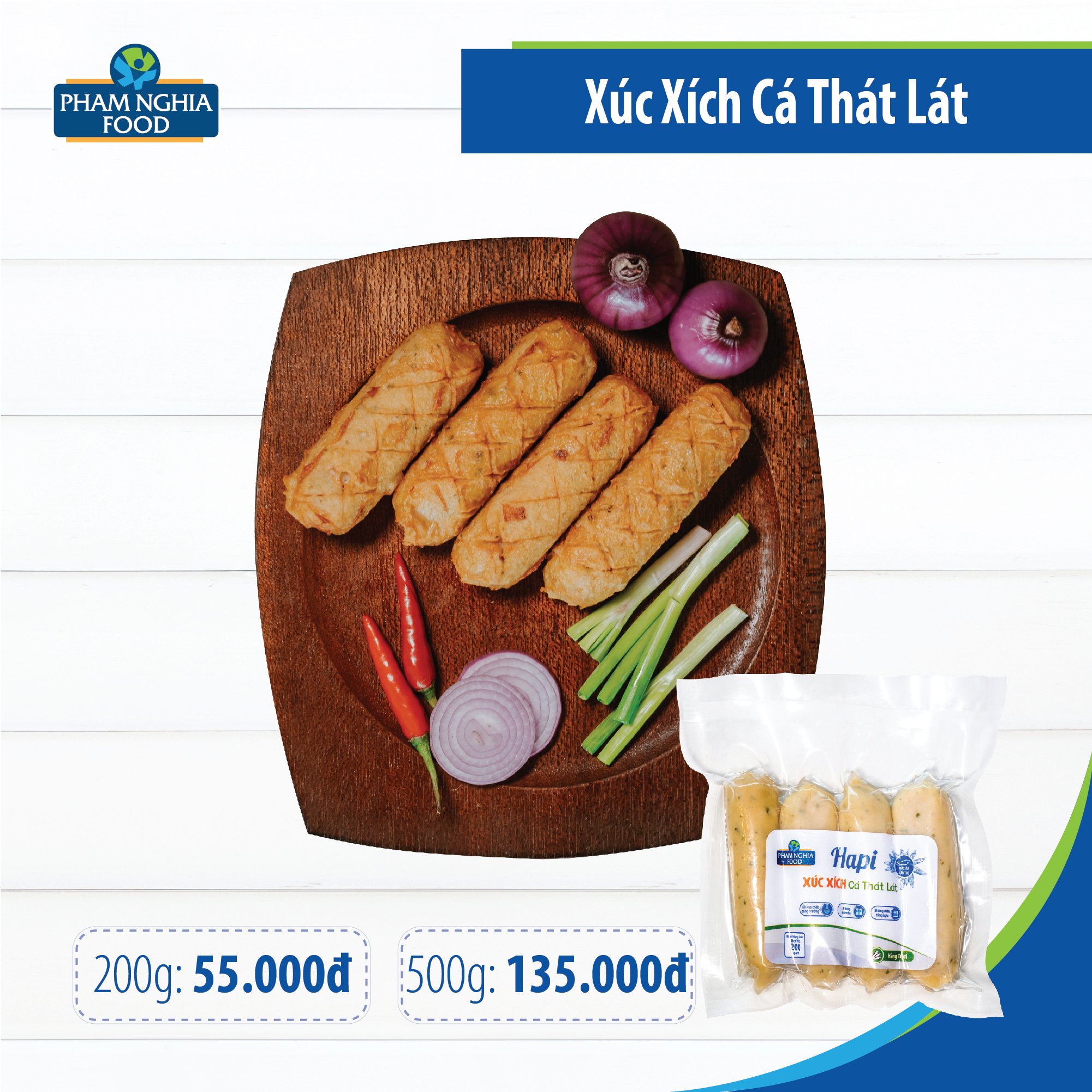 - Hapi xúc xích cá thát lát là sản phẩm độc quyền của Phạm Nghĩa Food. Với thành phần 100% từ nguyên liệu cá sạch (kiểm soát từ con giống, vùng nuôi…) nêm nếm vừa ăn, giúp cho xúc xích được dai, thơm và ngọt thanh đảm bảo chất lượng bữa ăn của gia đình.